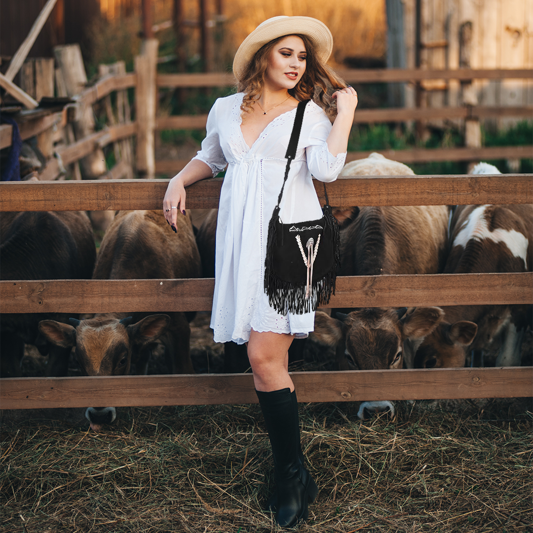 This black suede fringe crossbody purse blends boho flair with Western charm. Made from premium suede leather, it features intricate beadwork, a stylish silver concho, and long flowing fringes that make a bold fashion statement.