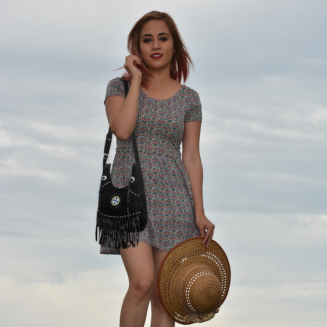 Detailed beadwork and flowing fringes bring movement and texture, while the adjustable strap lets you wear it as a crossbody or shoulder bag with ease. The top zipper closure keeps your belongings safe, and the spacious interior offers room for your phone, wallet, and keys—and even includes a concealed carry pocket for added convenience.